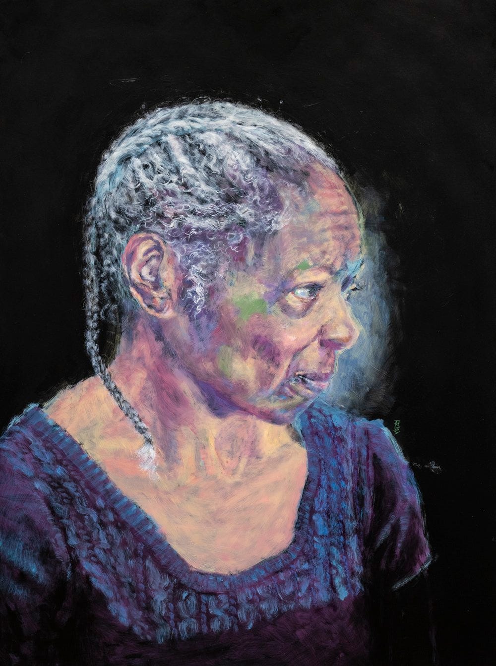 Espy: When she walked into church that day, it reminded me of my childhood because I was born in 1964. So my earliest childhood memories are from the seventies, and in the seventies, your sisters, your aunties, everybody had afros. So when she had that afro, it just felt like she would be a cousin of mine or, you know, part of my childhood, which is one of the reasons why I chose that background. I superimposed the Dairy Queen, but the background that I put there is from a scene from my hometown of Cincinnati. So, all of it feels like my childhood.