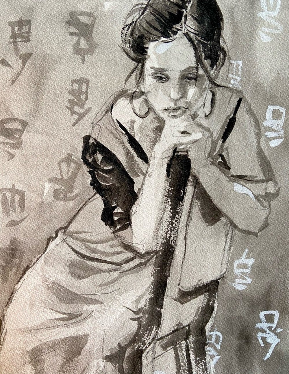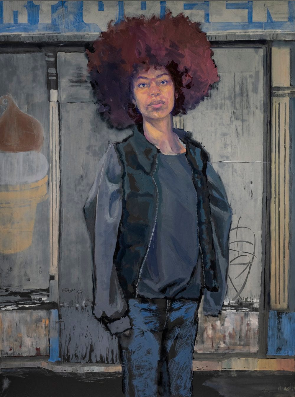 Espy: This is Evelyn. The whole time I had known her, she wore her hair in two cornrows. One day, she came to church, and it was in full bloom, right? She looked beautiful, confident, and proud. So she let me take a photo. As I was painting, I was still thinking about the “Context” exhibition. I wasn’t sure what I wanted to say about this painting, but I realized her experience in America, as a Black American, is of a mixed-race family. So I reached out to her and asked, “Hey, I got an idea. What do you think?”